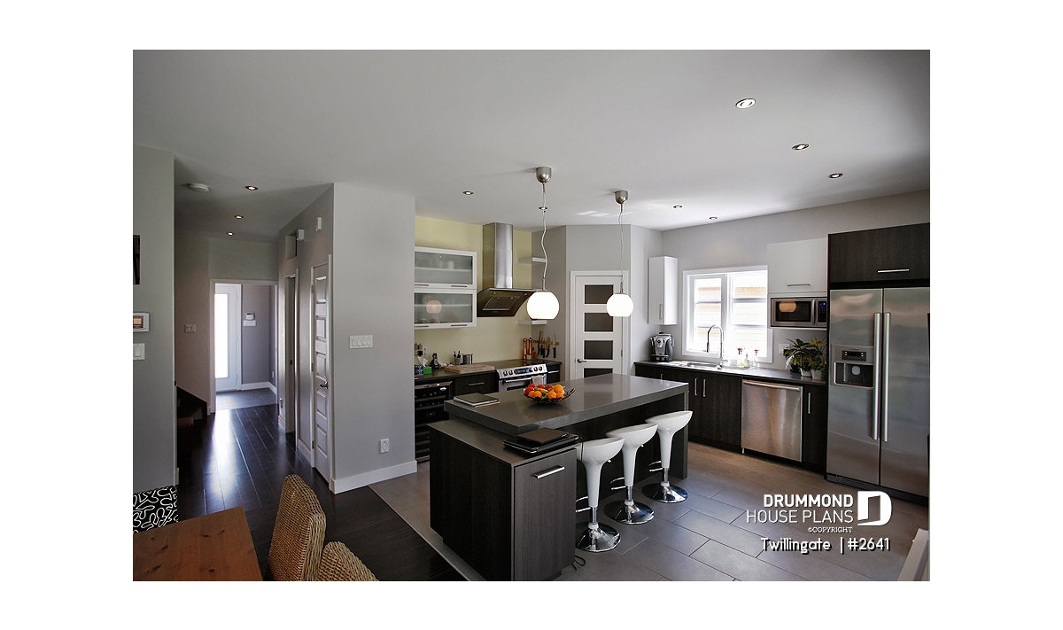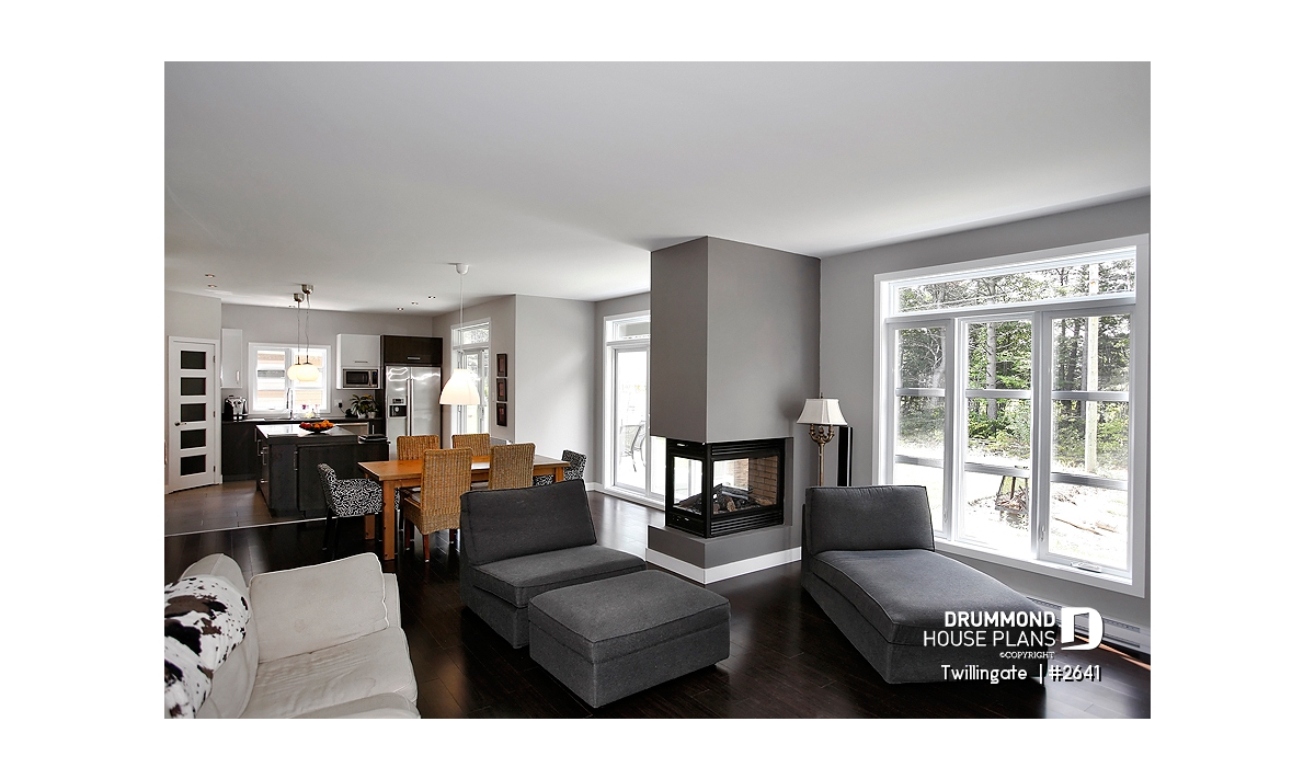 On the ground floor, one is greeted by an office or flex room by the front entry. Beyond, one finds a completely open activities area. The living room with fireplace easily flows to the dining area and then to the very open kitchen with island and eating bar.