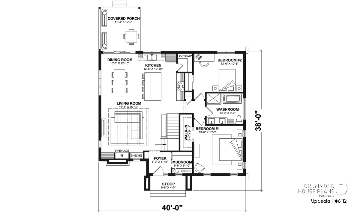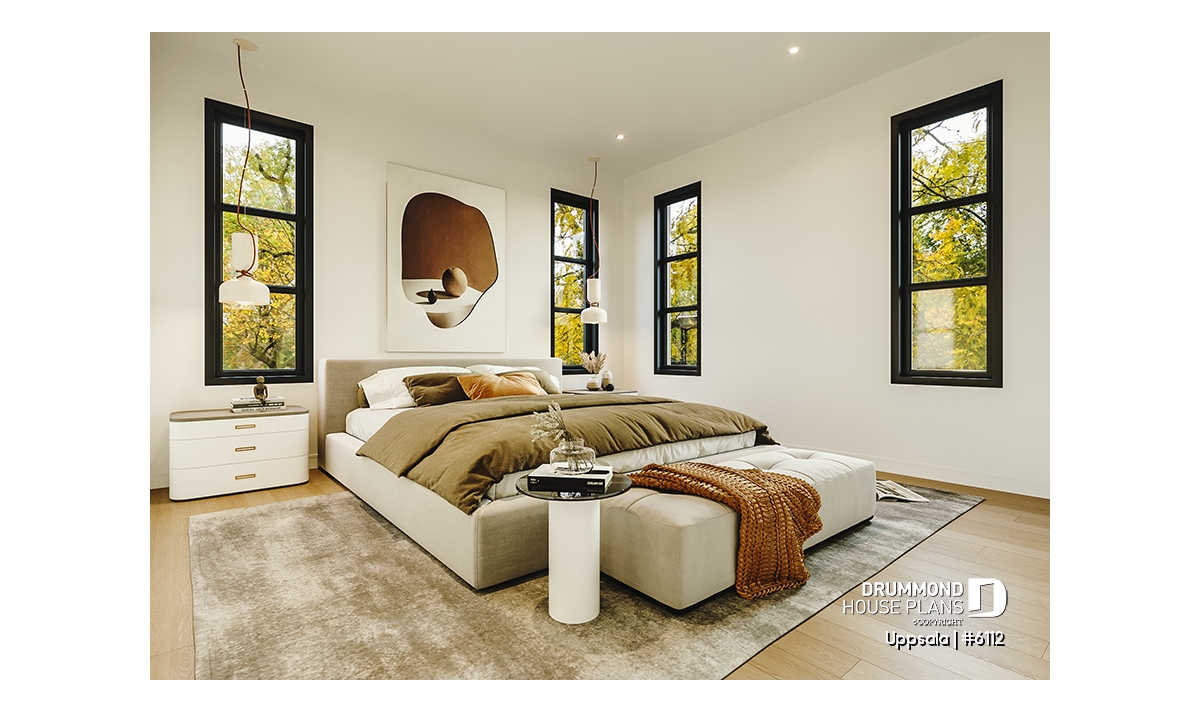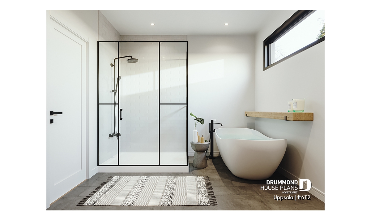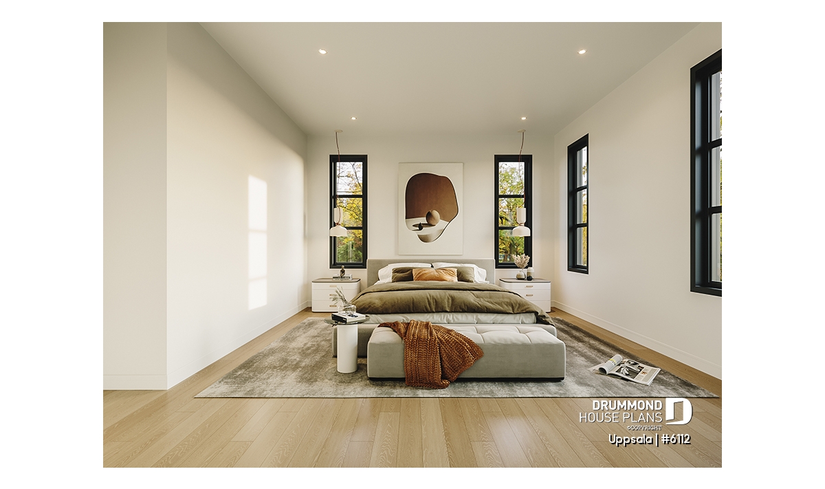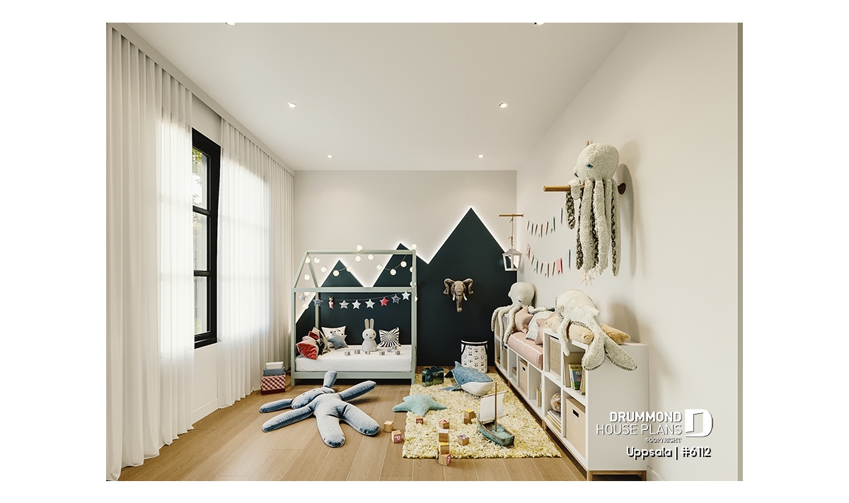 The plan in question here, UPPSALA (# 6112) brings together all the elements sought by families with 2+ children or adolescents. At the entrance, you find yourself in a closed vestibule with a walk-in style mudroom and bench. Then you access the open concept space including the kitchen, dining room and living room. A pantry and a large island are located in the kitchen. The living room has a raised ceiling over 10 'with decorative false beams. All the ground floor, other than the living room, has a 9 'ceiling. The parents' bedroom has a large walk-in closet and is adjacent to a large family bathroom. The latter includes a separate bath and shower as well as 2 sinks. A secondary bedroom is also located on the main floor for a total of 2 bedrooms on this level. In addition, a beautiful sheltered terrace of 11'4 '' x 12'0 '' is accessible from the dining room, convenient for dining outside when the weather is nice!