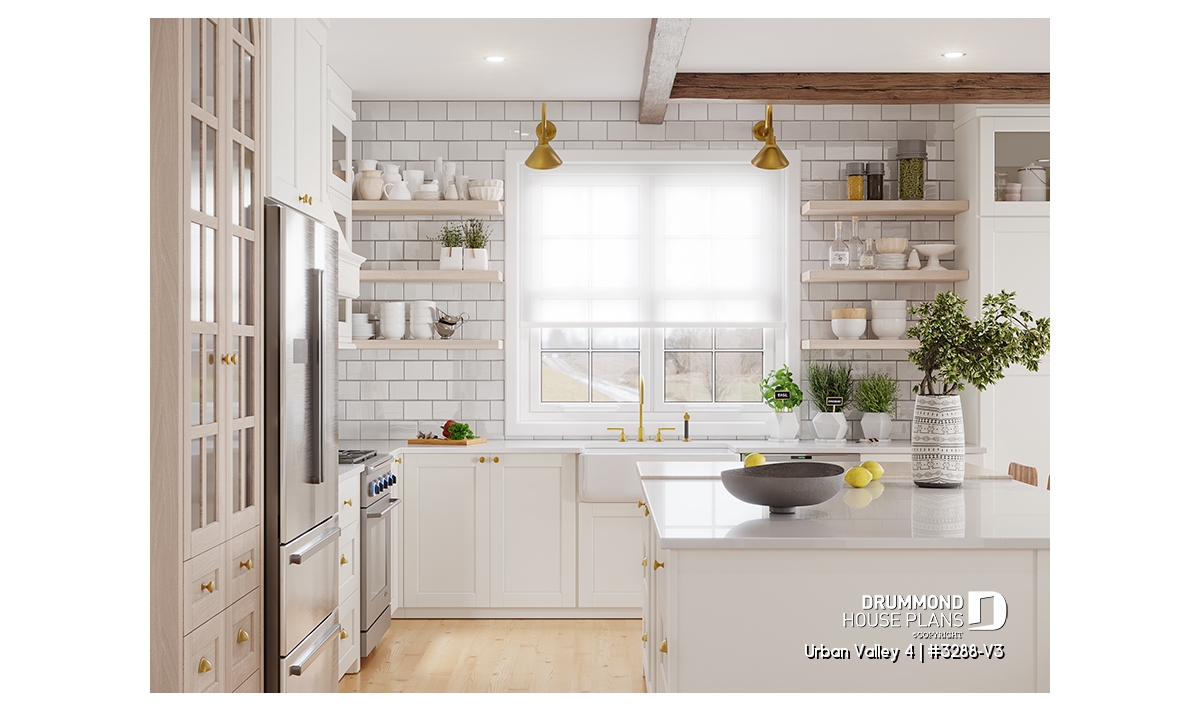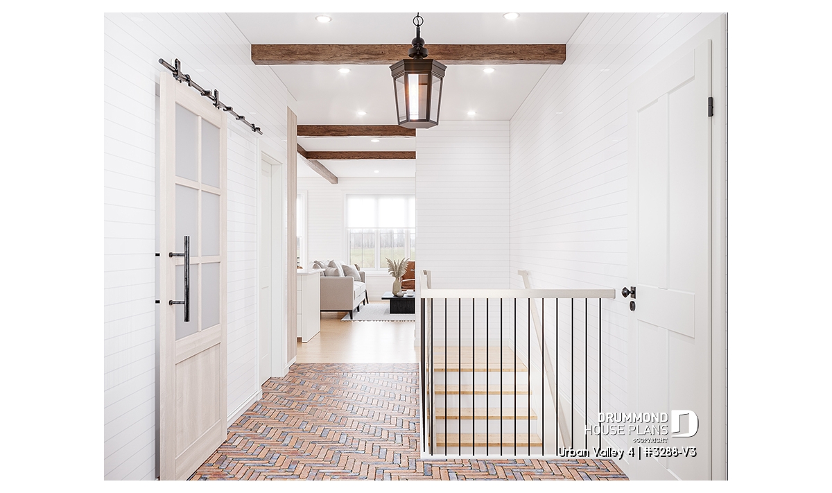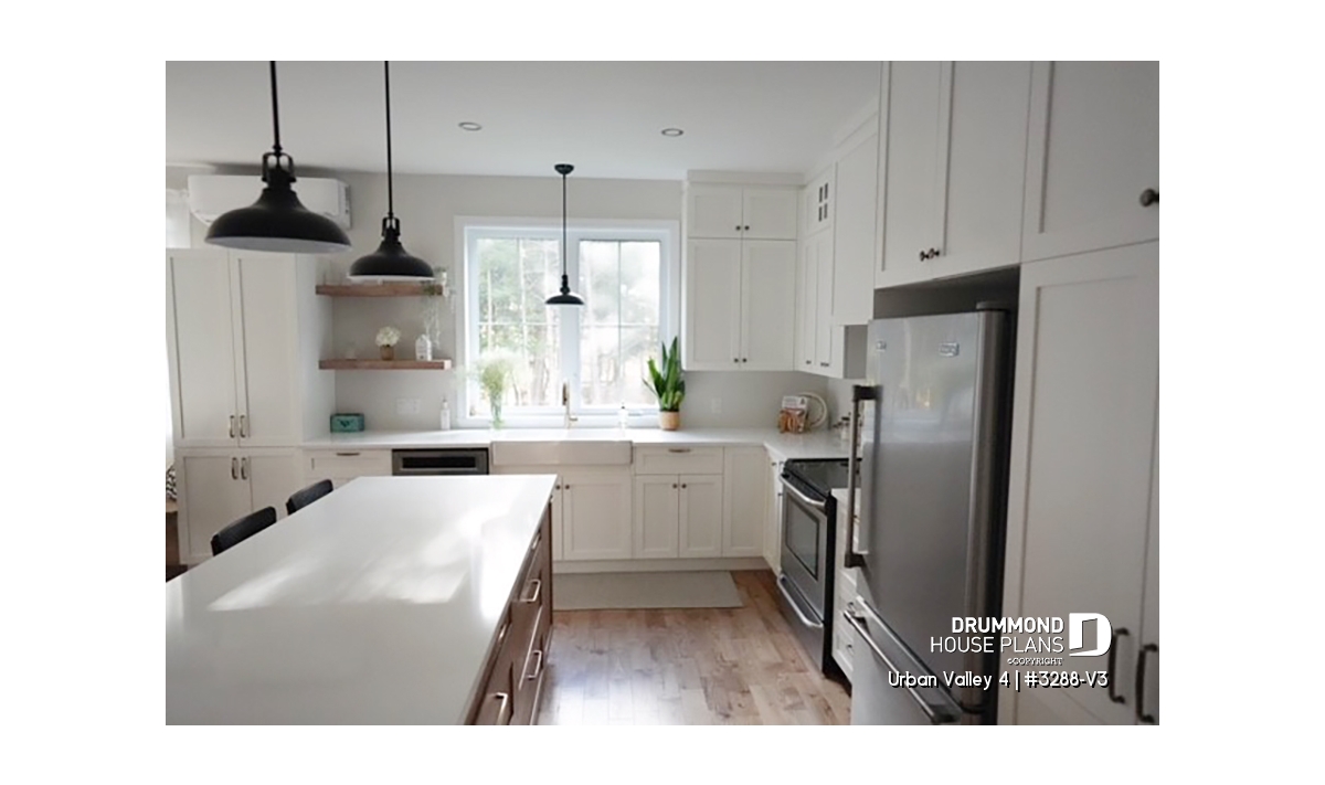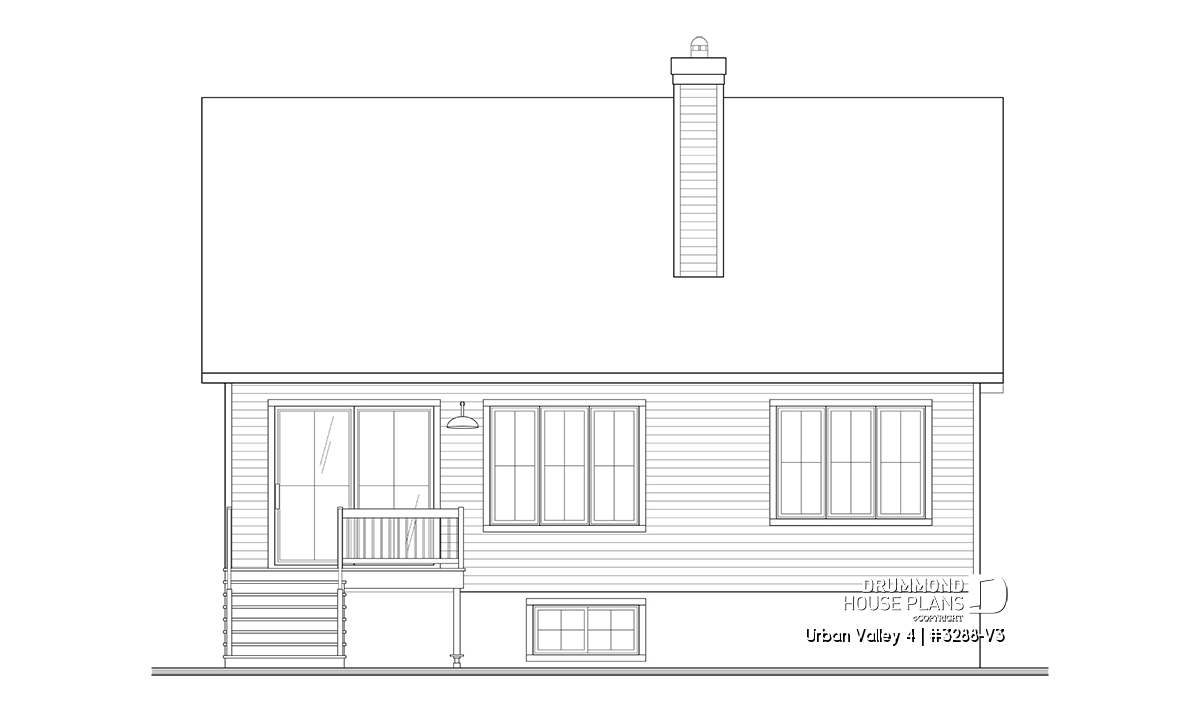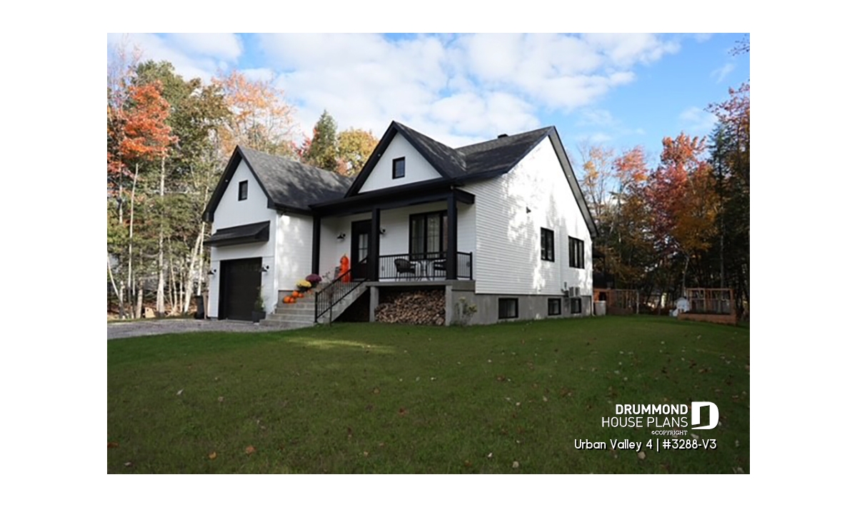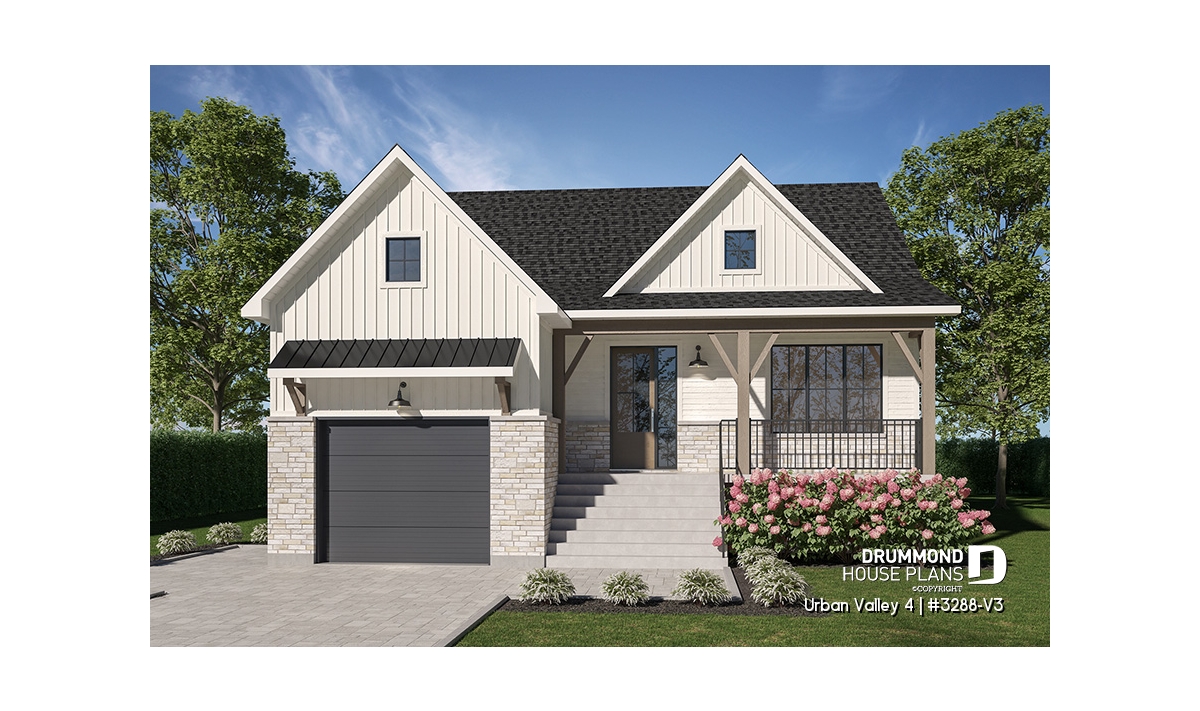 House plan "Urban Valley 4" (#3288-V3) offers 1339 sq.ft. on the ground floor, and the same in the daylight basement which is fully finished (optional $). This farmhouse-style bungalow includes a total of 1 to 6 bedrooms and 2 bathrooms on 2 floors. All ceilings on the main floor are 9' high. A single, attached garage is also offered with this model.