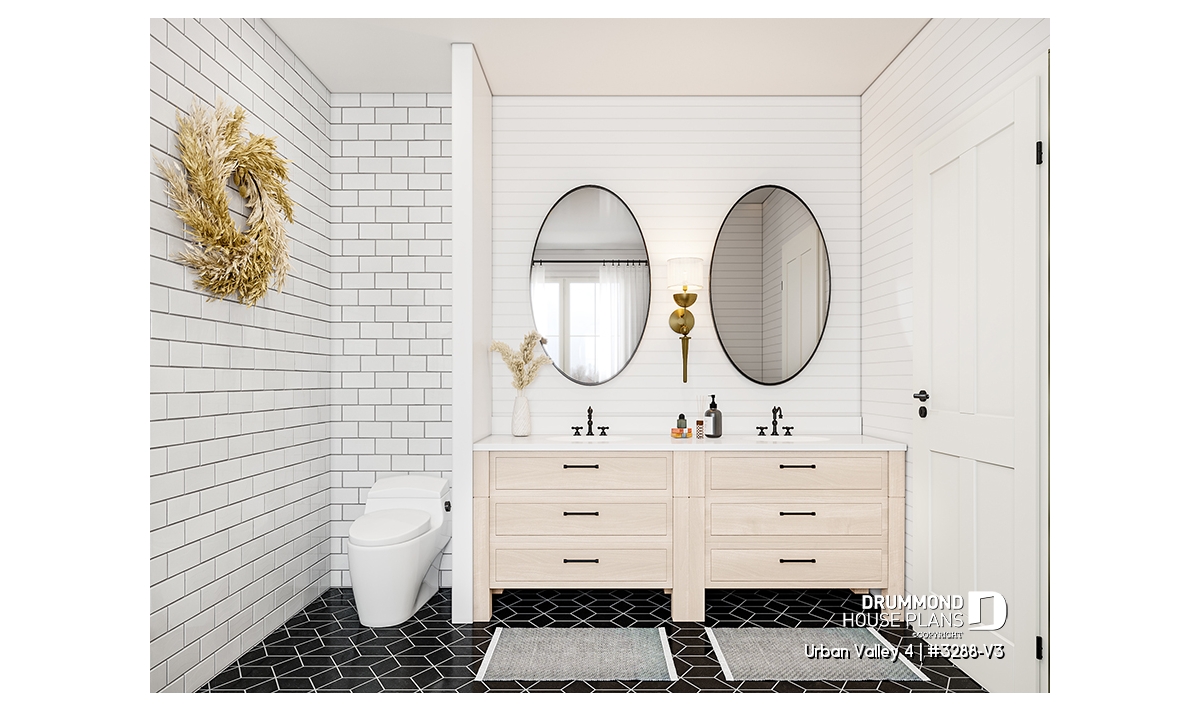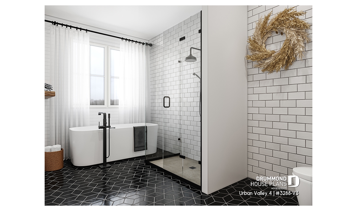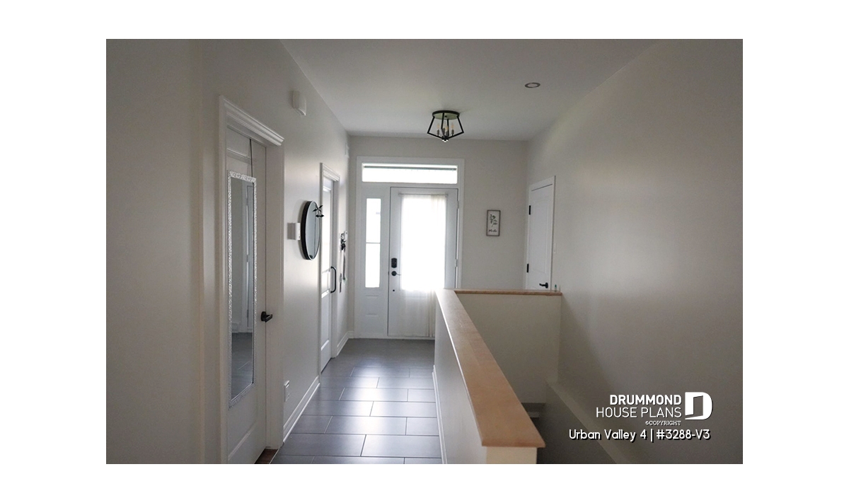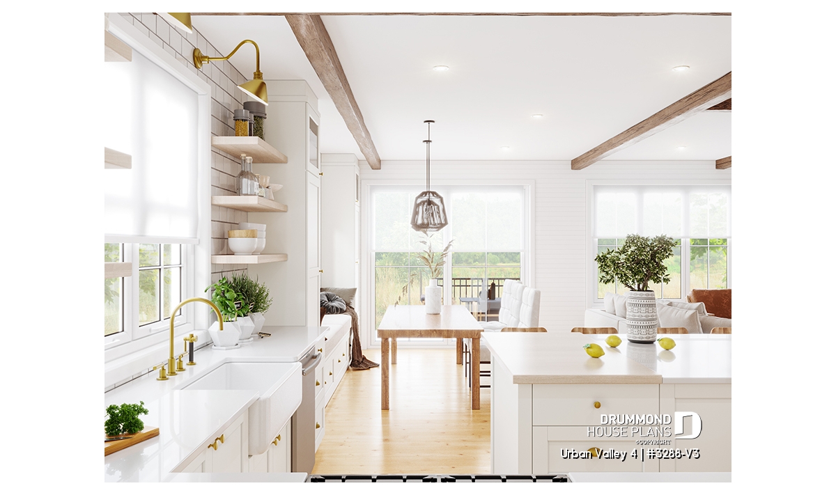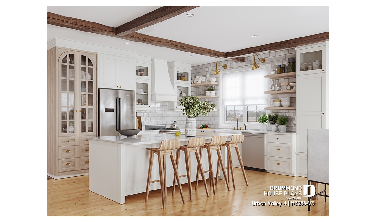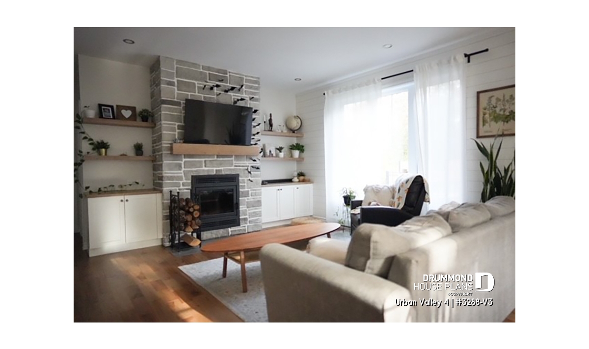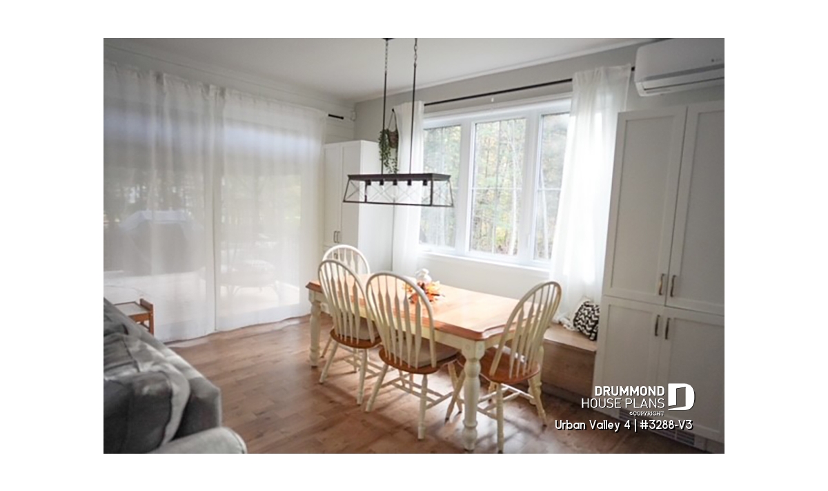House plan "Urban Valley 4" (#3288-V3) offers 1339 sq.ft. on the ground floor, and the same in the daylight basement which is fully finished (optional $). This farmhouse-style bungalow includes a total of 1 to 6 bedrooms and 2 bathrooms on 2 floors. All ceilings on the main floor are 9' high. A single, attached garage is also offered with this model.