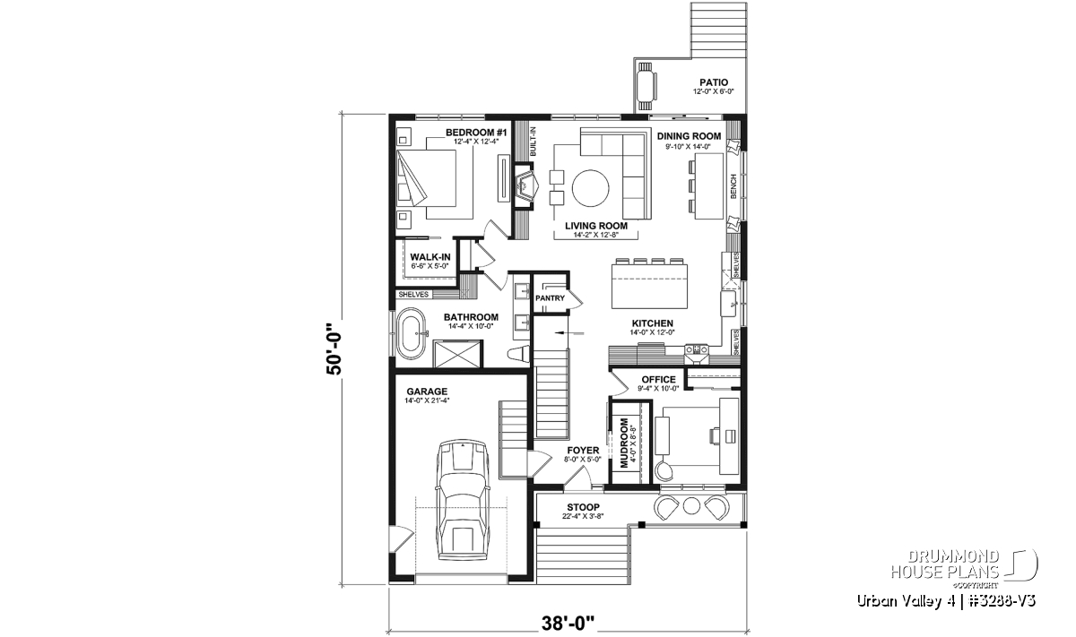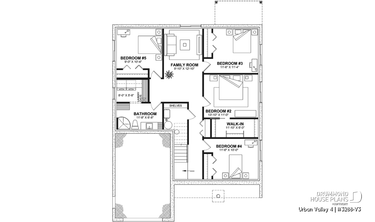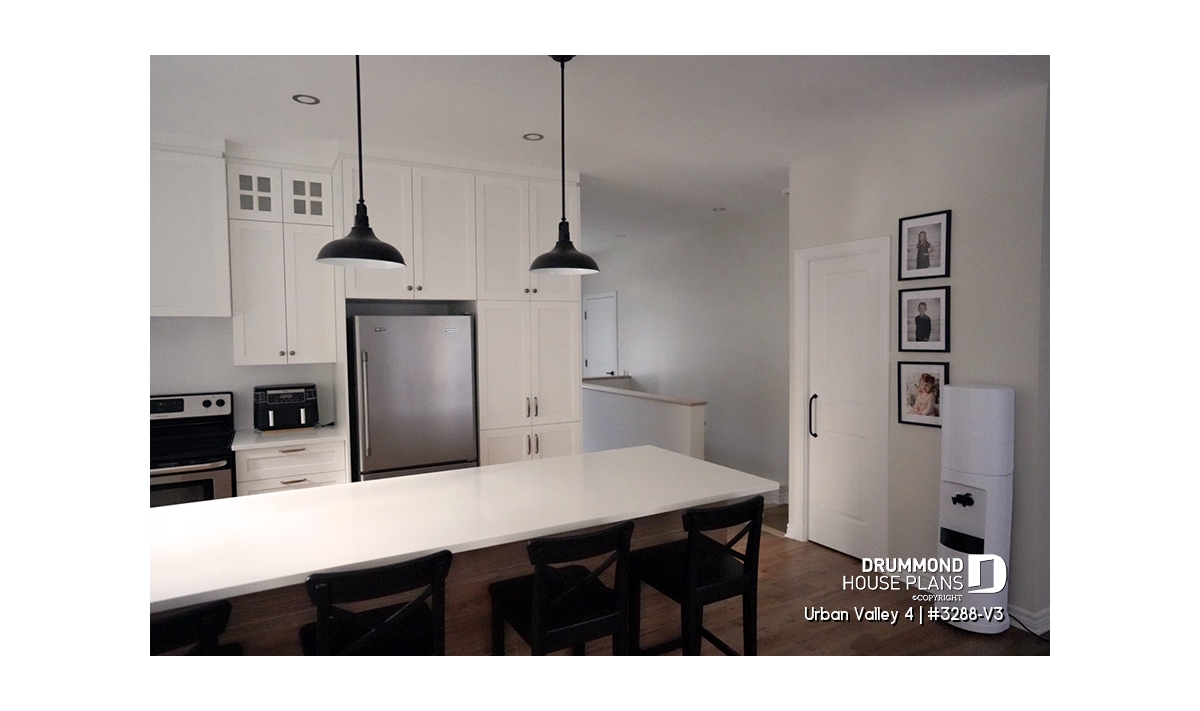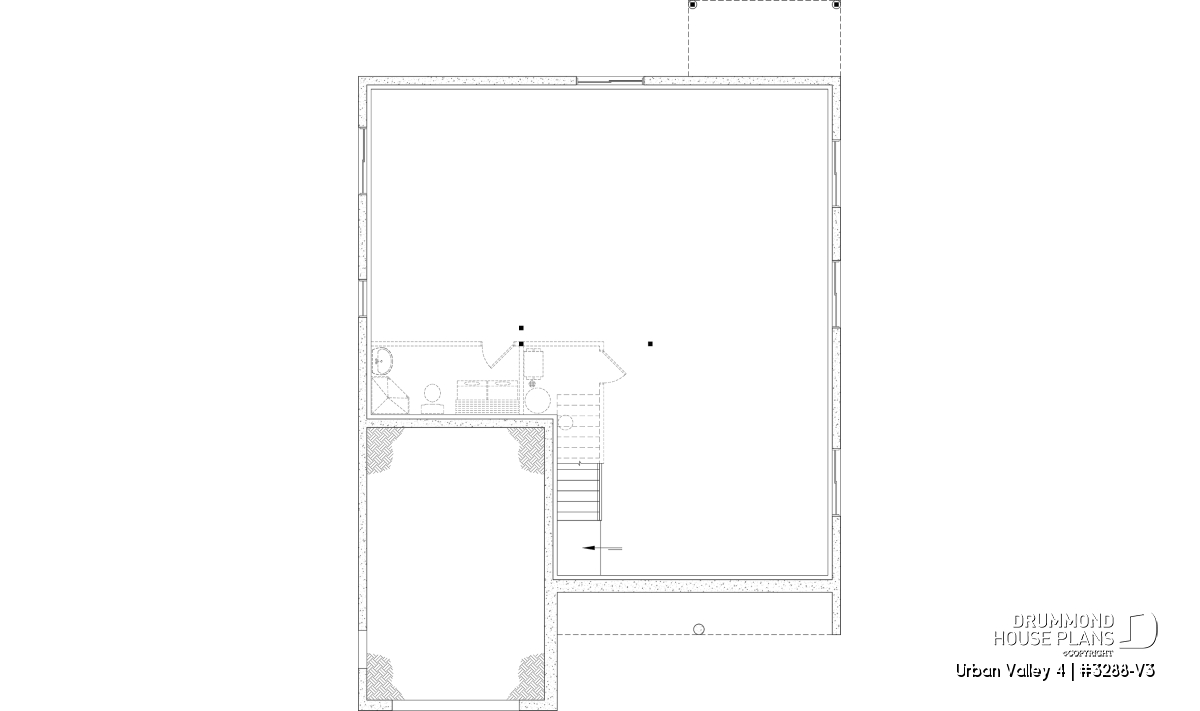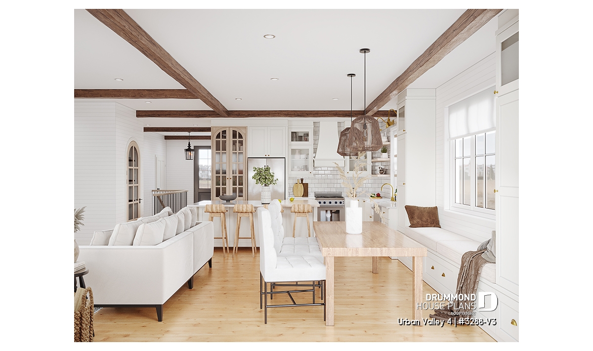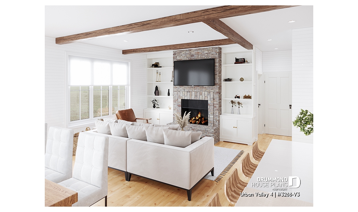 House plan "Urban Valley 4" (#3288-V3) offers 1339 sq.ft. on the ground floor, and the same in the daylight basement which is fully finished (optional $). This farmhouse-style bungalow includes a total of 1 to 6 bedrooms and 2 bathrooms on 2 floors. All ceilings on the main floor are 9' high. A single, attached garage is also offered with this model.