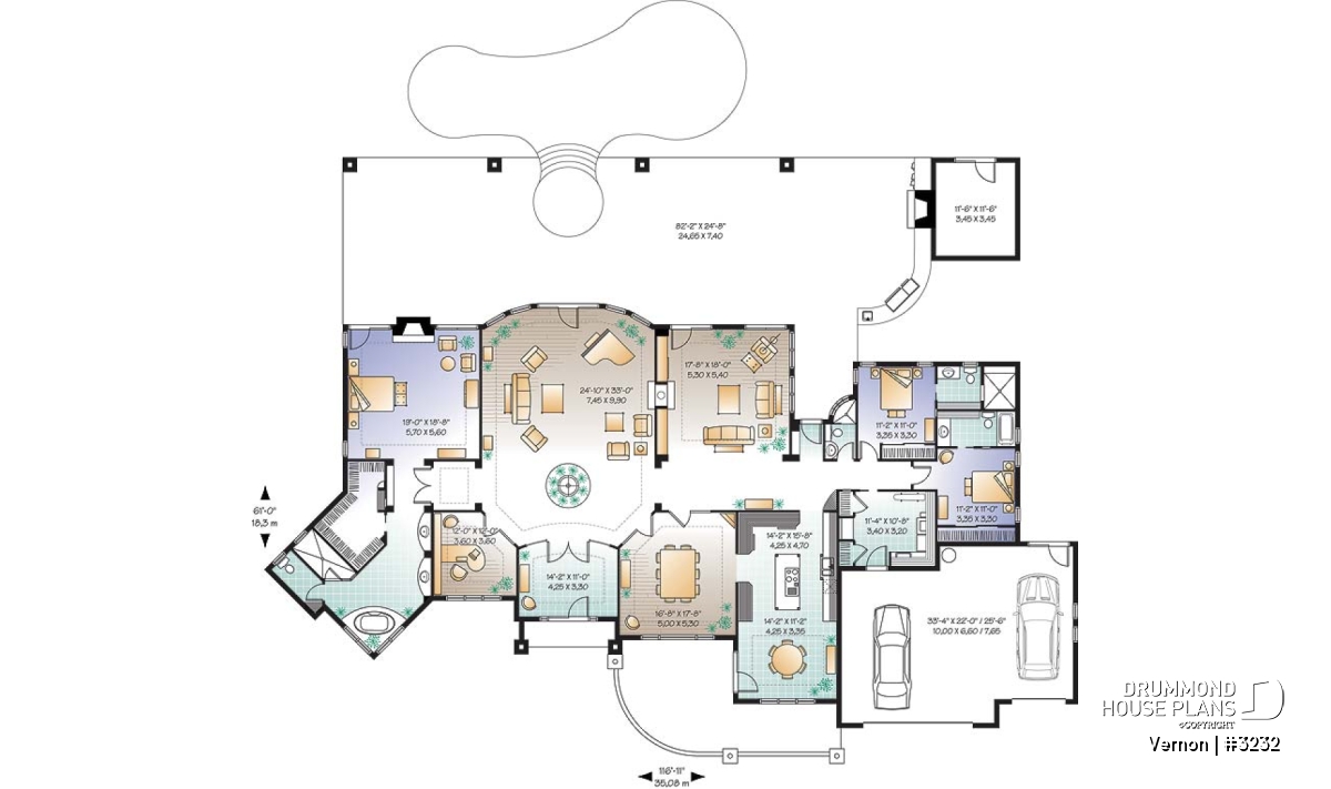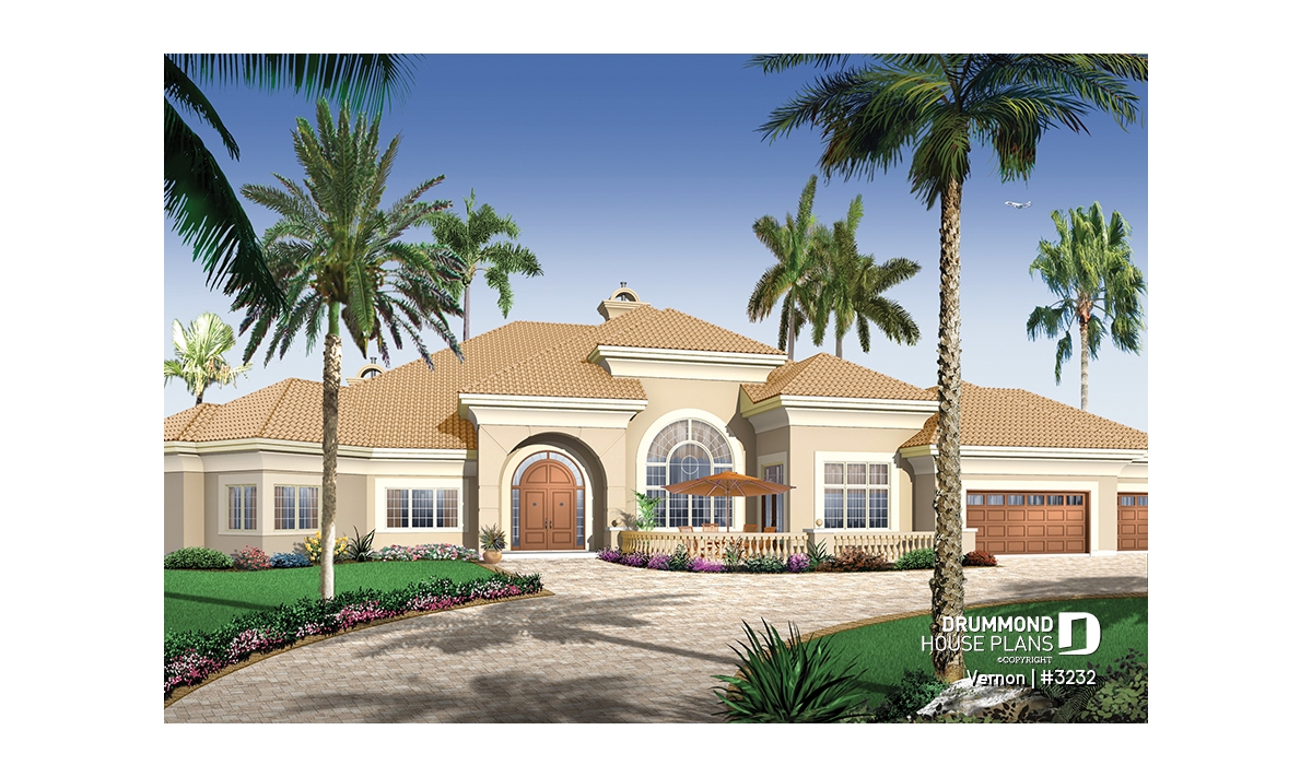 Remarquable entry with 14' tray ceiling. Superb family room with interior fountain and 11' tray ceiling. Dining room with 16' tray ceiling. Kitchen with 13' tray ceiling. Ceilings at 10' everywhere else, with tray ceiling in master suite, living room and office. Abundant windows for rear views, vast covered patio with integrated spa, interior kitchen, fireplace or bbq and appropriate storage areas. Built-in furniture or storage areas built-in to the living room, master suite and laundry area. Fireplace shared between living and family rooms. Fireplace in master suite. Kitchen and dinette at front with access to exterior patio. Three-car garage.