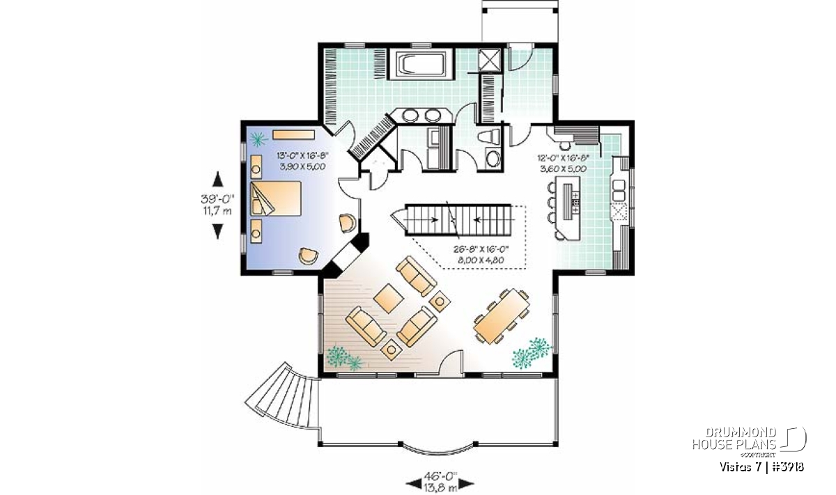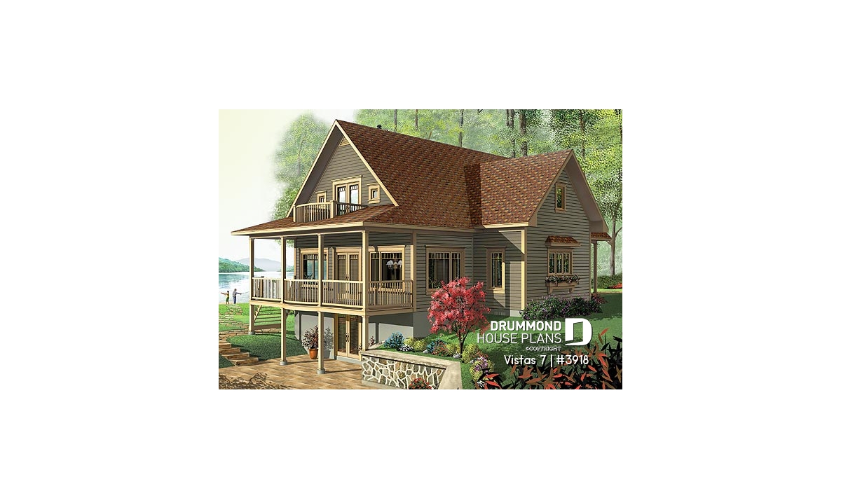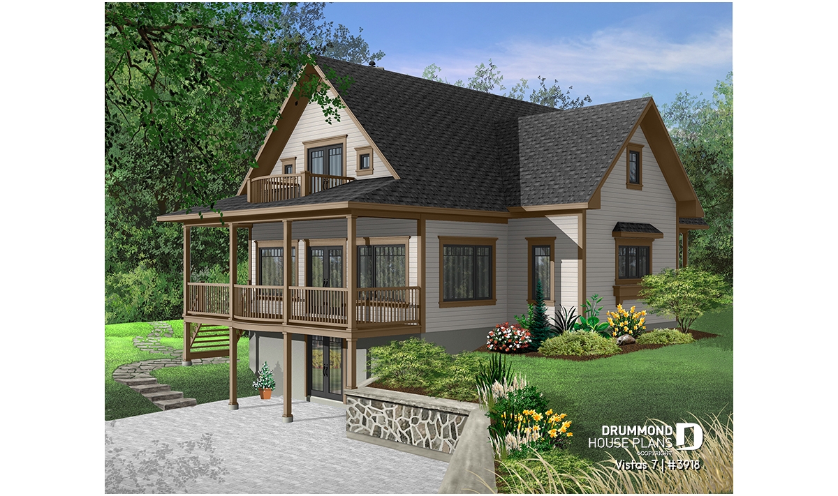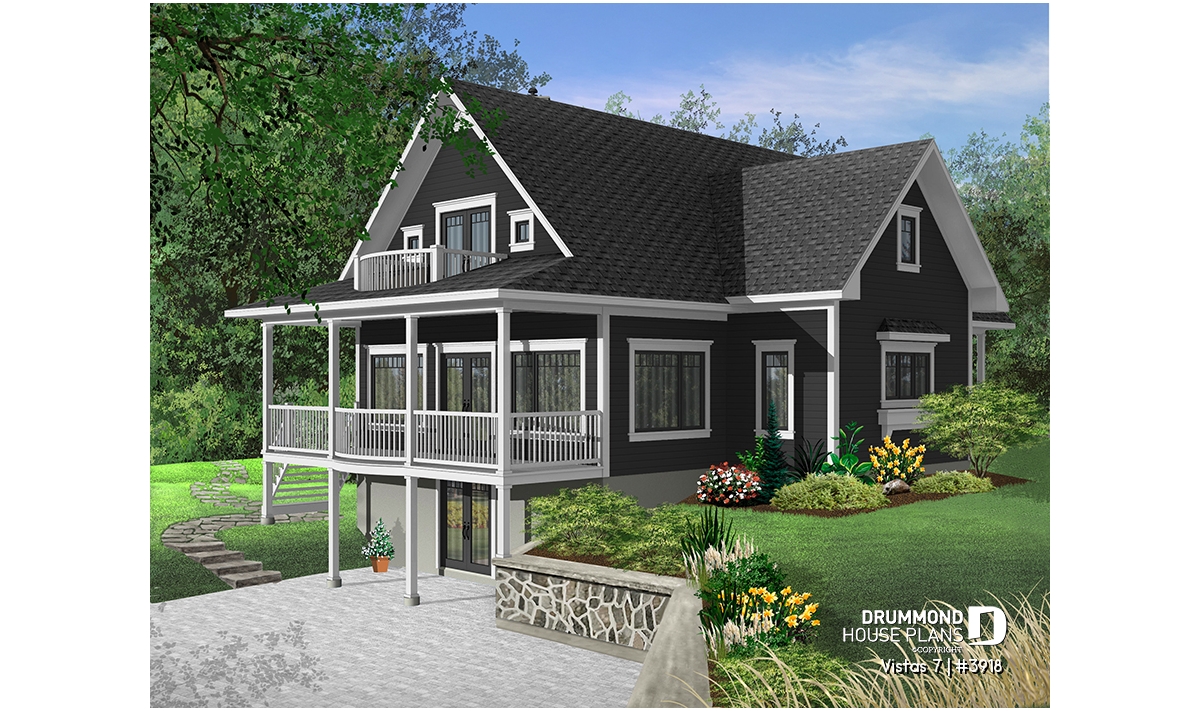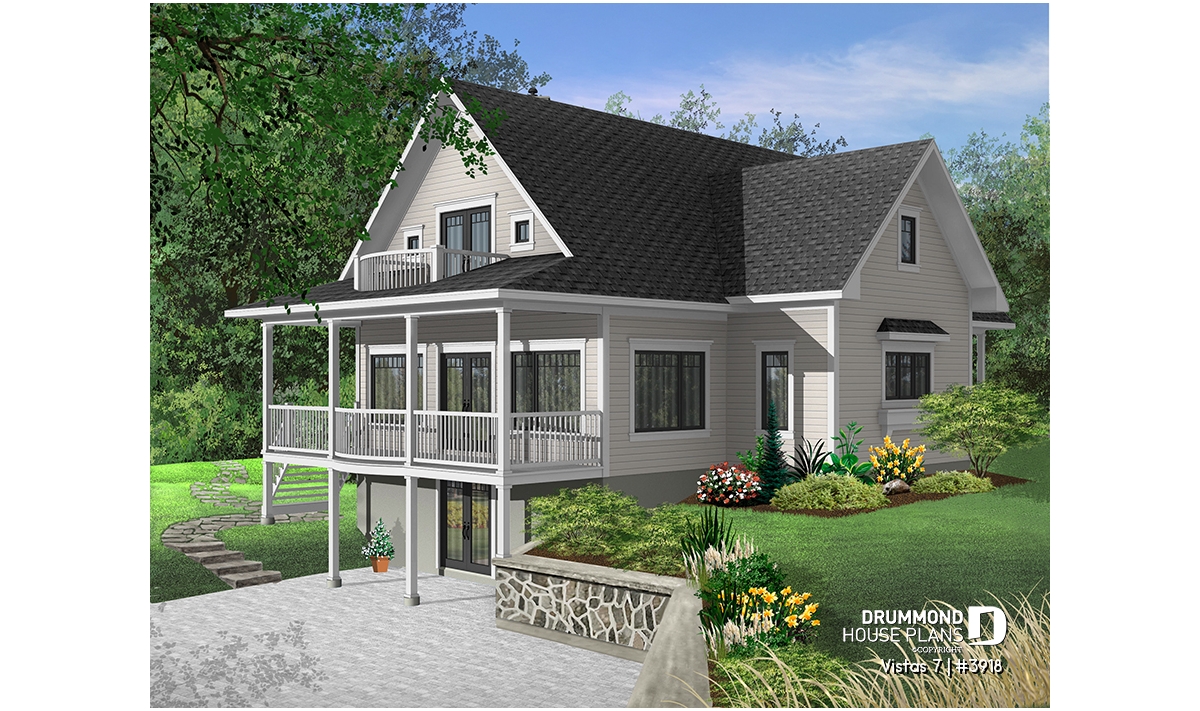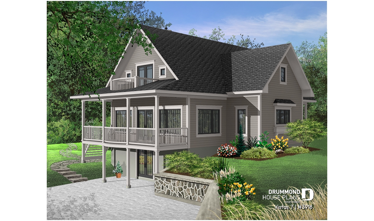 Outside, a large sheltered balcony ensures as much comfort outside as inside. In areas where mosquitoes abound, screening can be installed on the perimeter of the balcony for peace and comfort while eating outside.