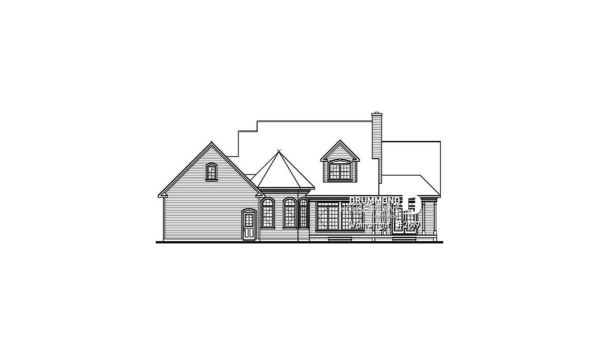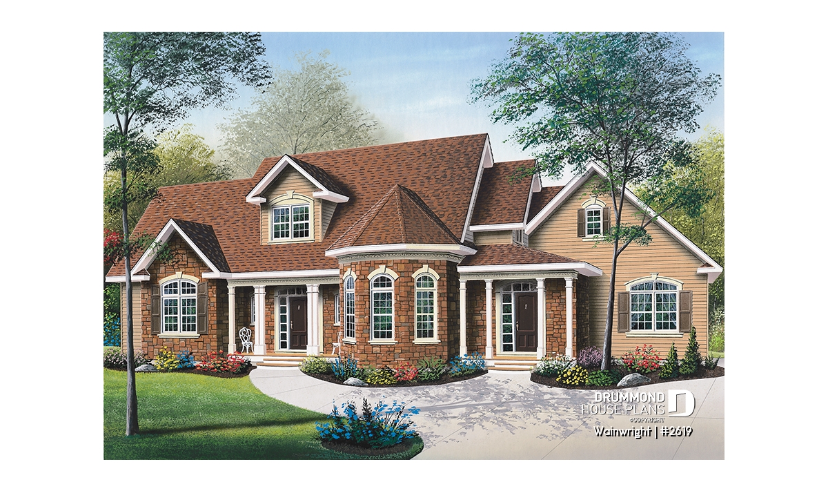 With 2259 sq.ft., this design has plenty of personality. Here’s the practical side--3 bedrooms/ 2.5 bathrooms, two-car garage and excellent closeting. Now for the creative side—sunken family room with fireplace, a reading nook adjoining one of the secondary bedrooms, and a second-level family room. Outside, dormers, special windowing and a covered front porch play up the charm.
