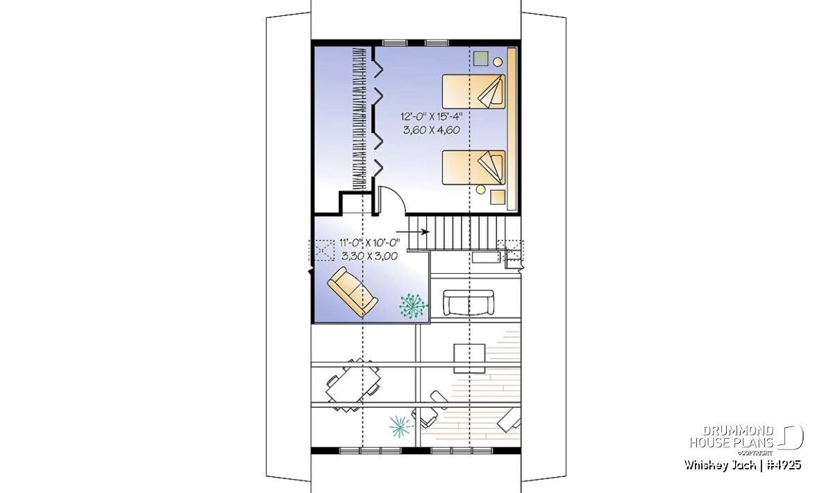 Vaulted ceilings with timber details great you in this two-bedroom chalet plan. Expansive windows paint the open activity area in light. The master bedroom on the main floor makes this an ideal getaway property, even for baby boomers. Main level laundry, a full bathroom and generous entry with storage complete the main level amenities.