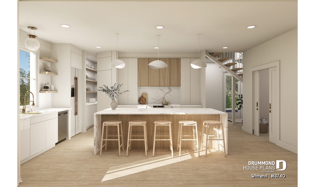 Kitchen with large pantry and island.