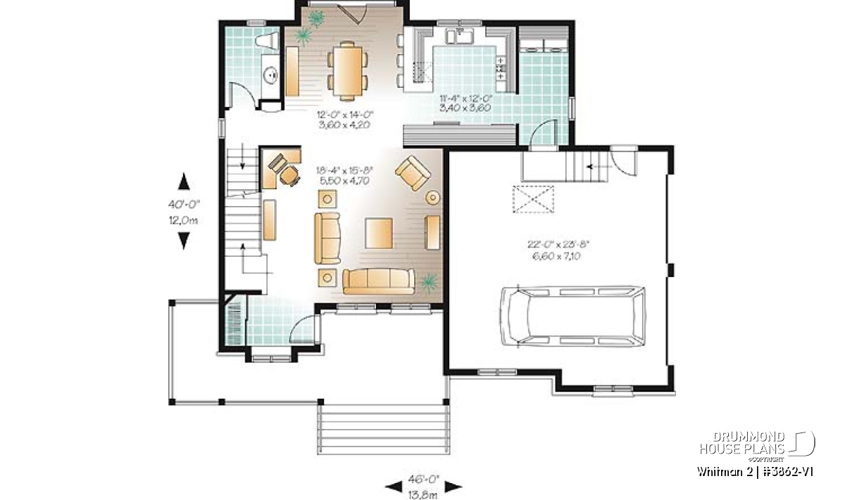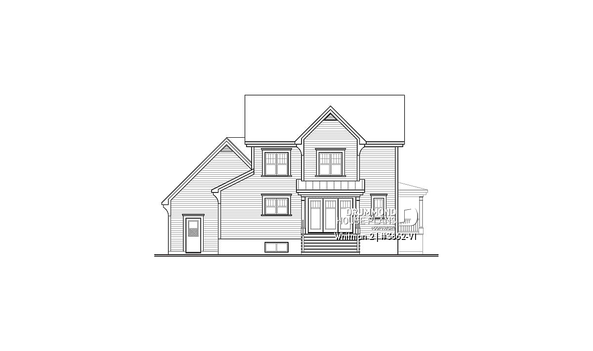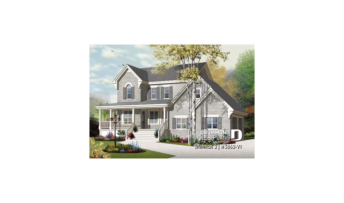 A large, covered porch ensures a welcoming entrance. The presence of the garage is concealed by forward-facing windows and gable detail and discreet side doors.