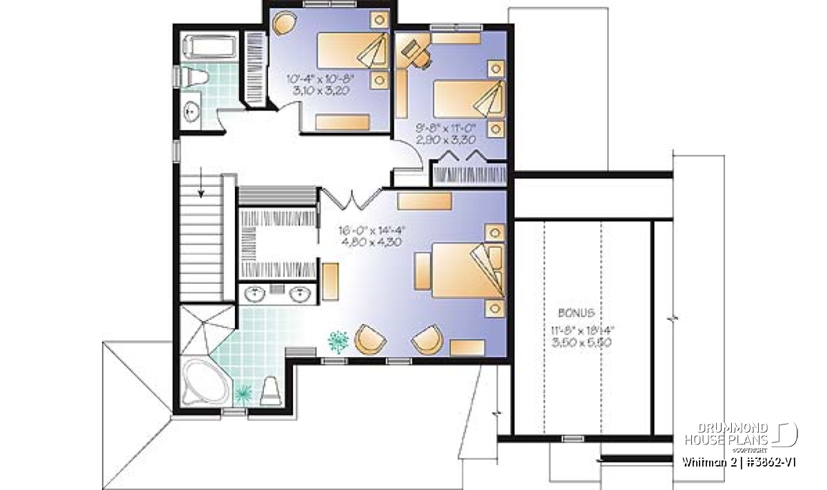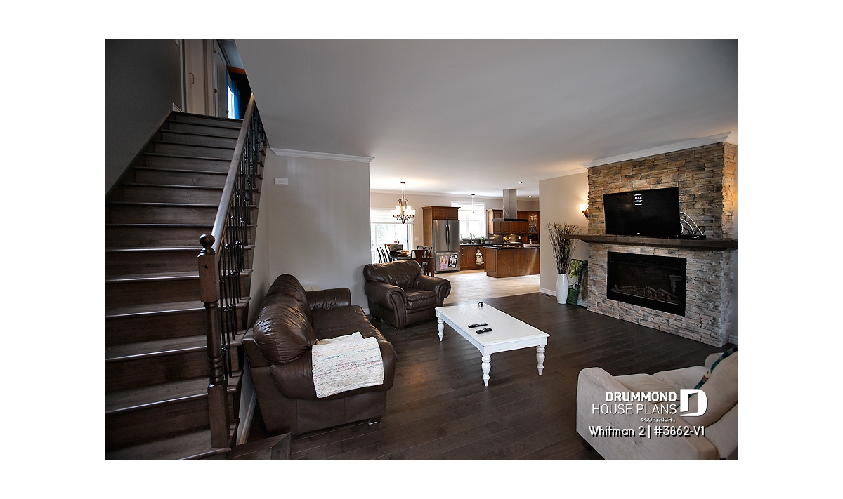 Large living room with computer area. Master suite upstairs with dressing room, walk-in closet and full bathroom offering a 56" x 52" shower. Side-entry double garage with storage above.