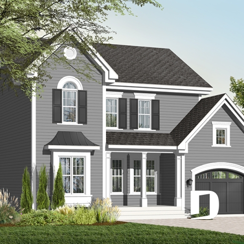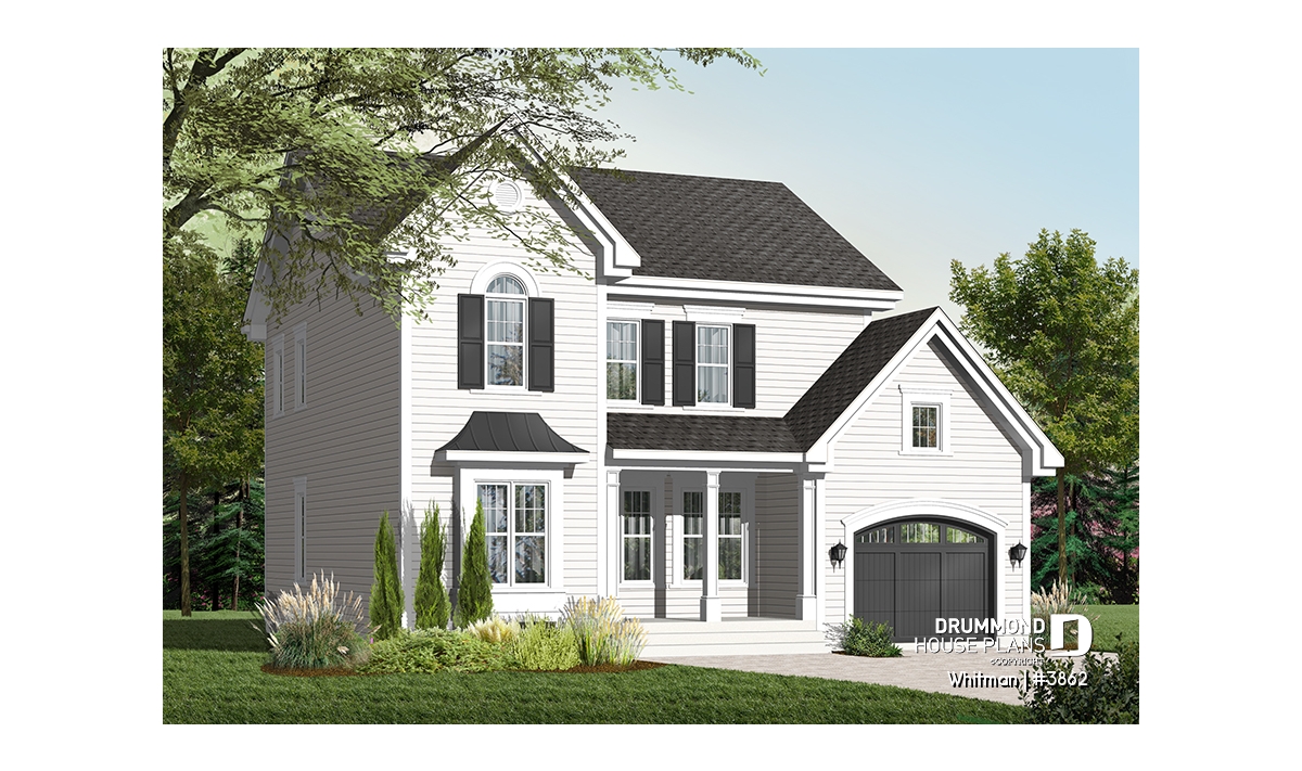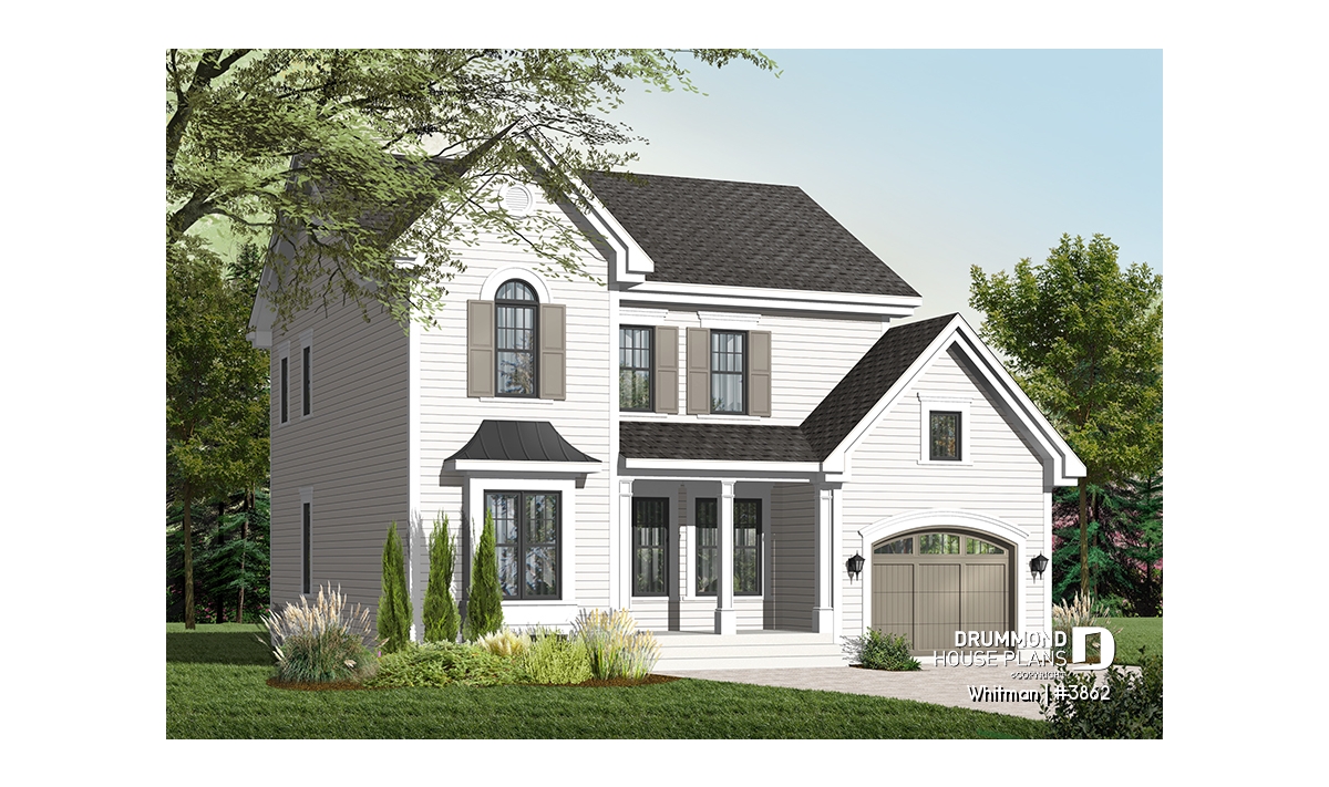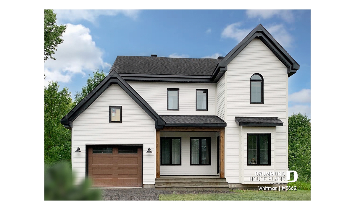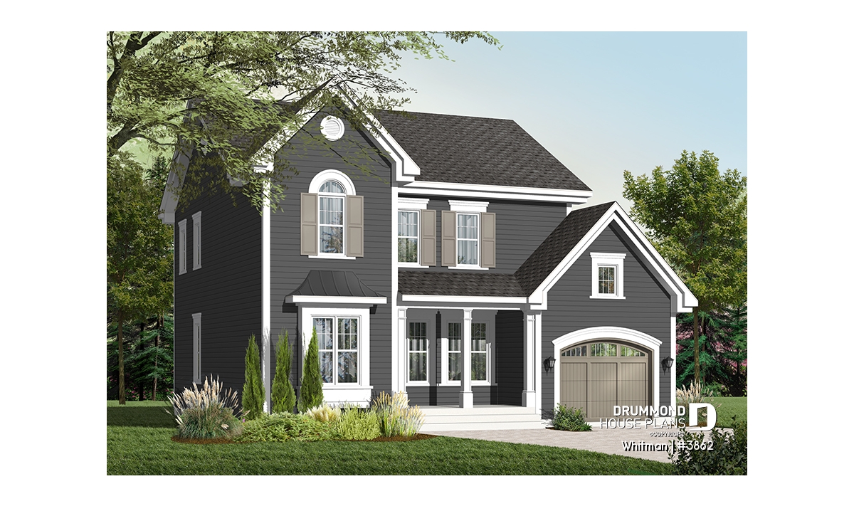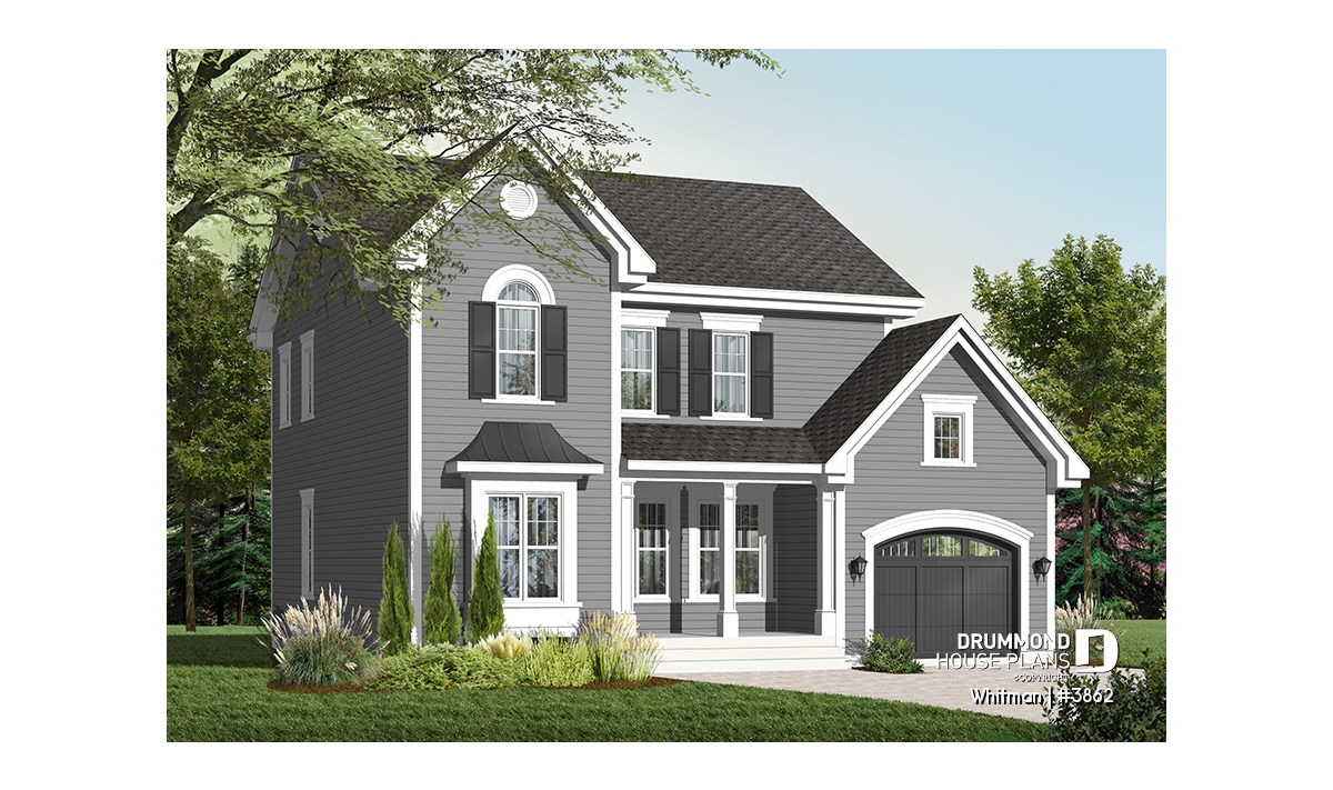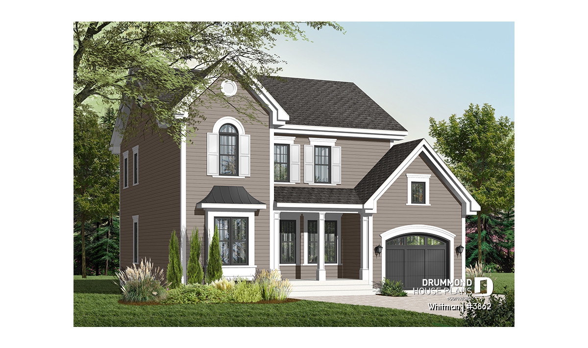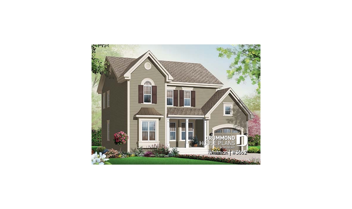 An inviting covered porch offers protection from the elements to the main entrance foyer which has a projecting window to add a unique touch. The garage blends well with the simple yet elegant volumes to enhance balance and ensure curb appeal.