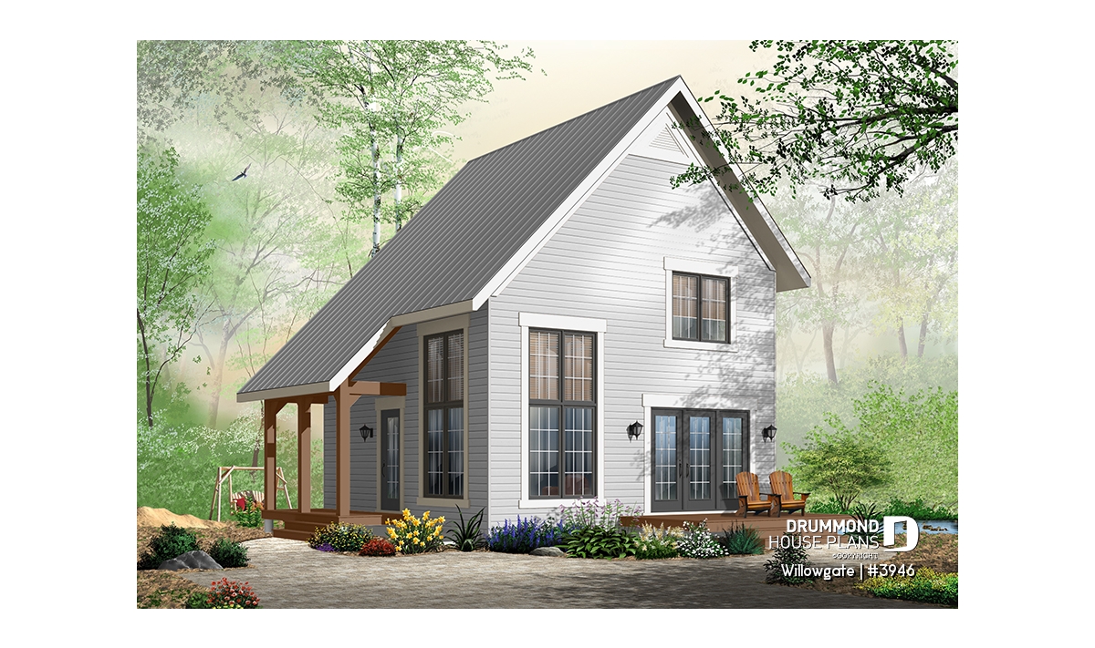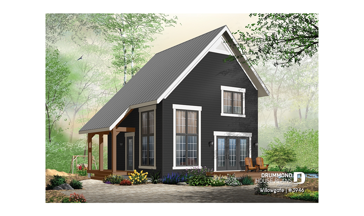The Willogate (#3946) house plan offers a Scandinavian-inspired cabin design that blends clean lines, warmth and simplicity. With its compact 24’ x 24’ footprint, this plan is designed for efficient construction while maximizing natural light and scenic views—an essential feature for a modern cabin or vacation home.