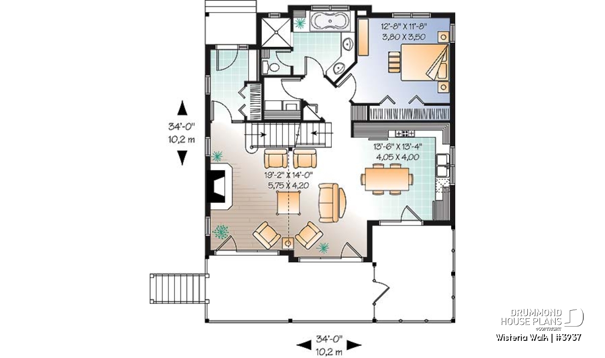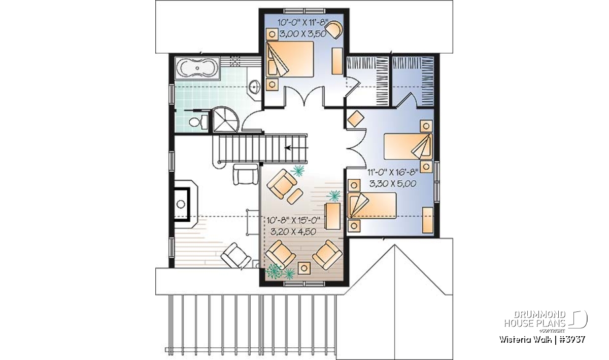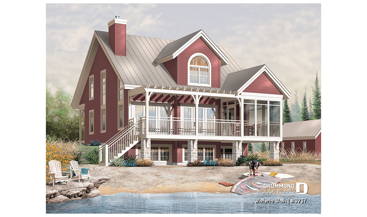 We cannot stay silent about that superb rear gallery adorned with a pergola, a screened in area, so much appreciated in panoramic areas, and the double garage with upper storage, sold separately and which can be viewed on our site drummonddesigns.com under the number 2987 in the garage plans.