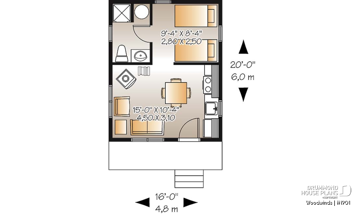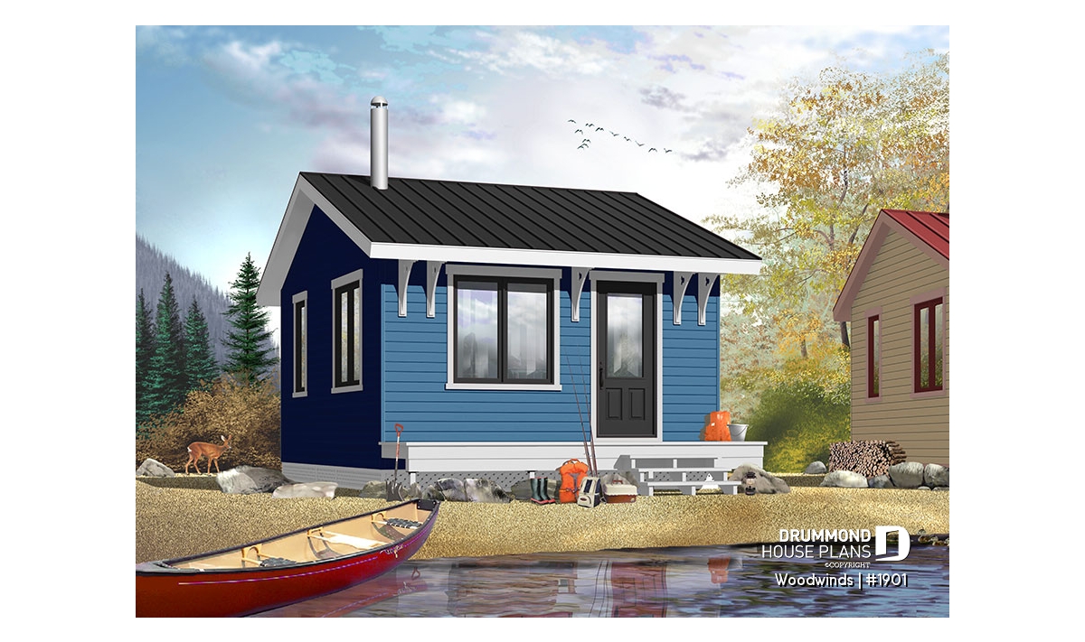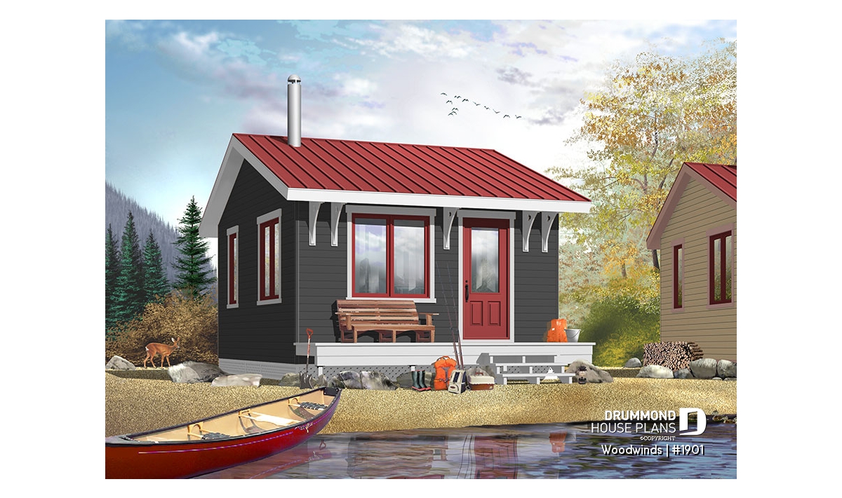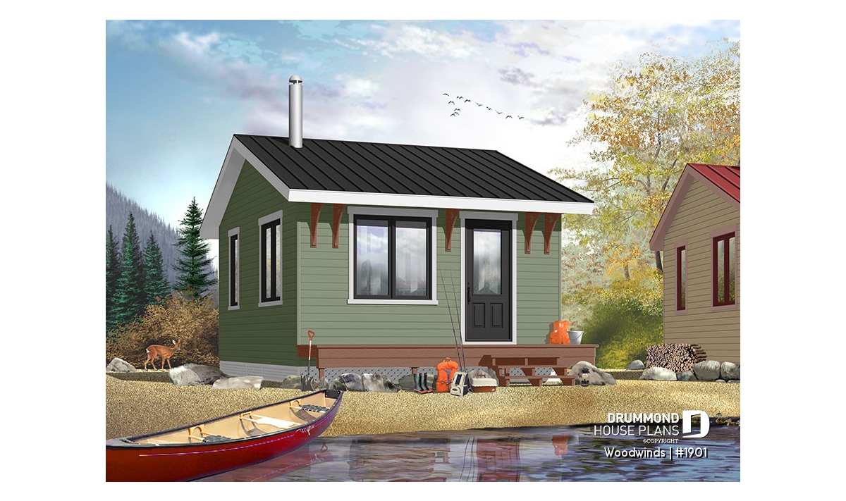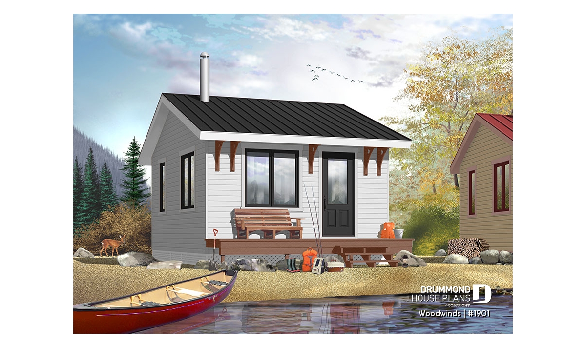 Maximizing interior space is important with compact getaways and this model, includes one bedroom and a shower room (optional in the 3-season house plan option) on the back and can accommodate up to six people if arranged creatively.