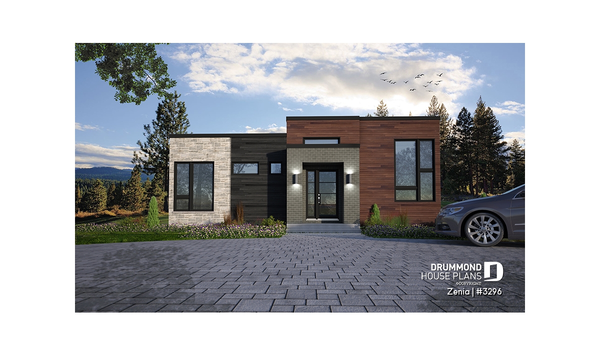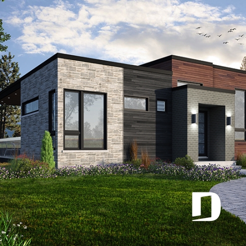Cube shaped Modern style house plan with very trendy exterior coatings and colors like two-tone wood and gray stone.